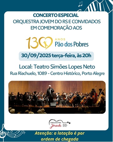 Concerto 130 anos do Pão dos Pobres – apresentação da Orquestra Jovem do Rio Grande do Sul. Terça-feira, 30 de setembro de 2025, às 20h. No Teatro Simões Lopes Neto — Rua Riachuelo, 1089, Centro Histórico, Porto Alegre. Participação especial do artista Hique Gomez, e mestre de cerimônia a jornalista Patricia Parenza – ambos os embaixadores da instituição. Entrada gratuita, com lotação por ordem de chegada ou ingresso antecipado no Pão dos Pobres, das 8h às 12h. E das 13h30min até às 17h.