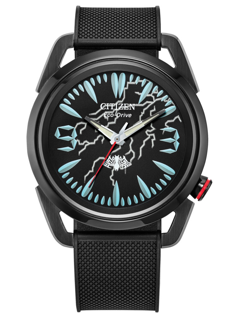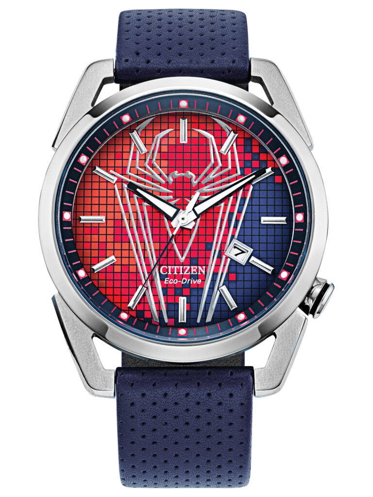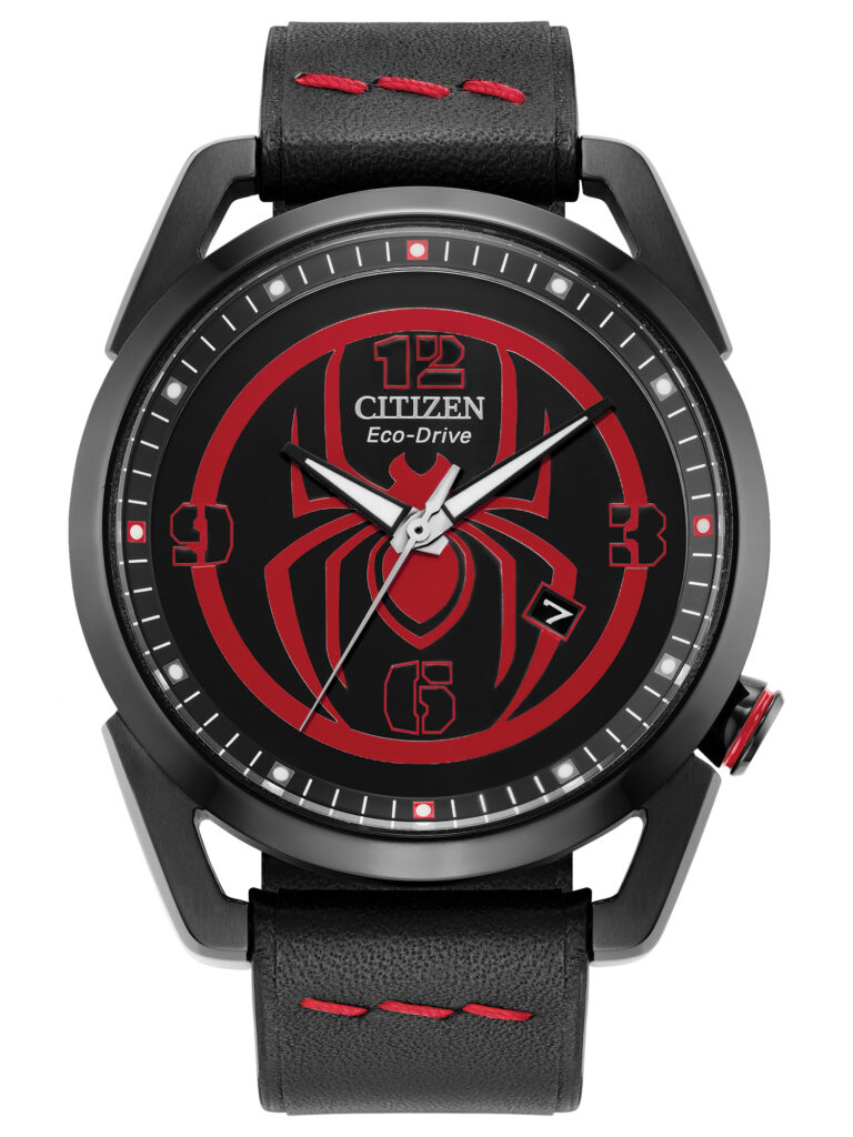Citizen Marvel – Miles Morales: É inspirado no universo do herói Miles Morales e apresenta mostrador preto com o logotipo do personagem, além de ponteiros e marcadores com acabamento luminescente para excelente legibilidade. A caixa em aço inoxidável de 42 mm, com asas que remetem ao estilo aracnídeo, contrasta com a pulseira de couro preta com costura vermelha, criando um visual moderno e marcante. Equipado com movimento calibre J810 e tecnologia Eco-Drive, que utiliza qualquer fonte de luz e dispensa troca de bateria, o modelo conta ainda com cristal mineral esférico resistente a impactos, detalhes temáticos exclusivos e gravação especial “Find Your Power” no verso da caixa. Com resistência à água de 100 m (10 bar), está disponível por R$3.990,00.