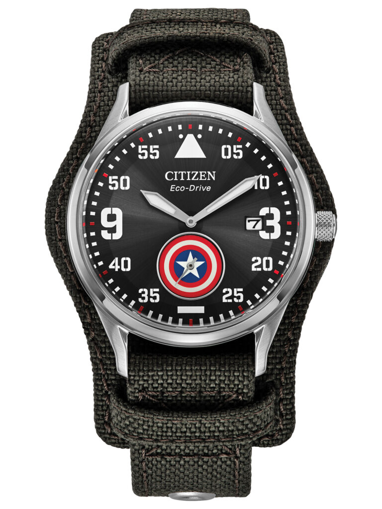 Citizen Marvel – Capitão América: Presta homenagem ao lendário herói combinando visual militar e design contemporâneo. Seu mostrador preto traz o escudo icônico em destaque, acompanhado de uma pulseira em tecido CORDURA® cinza-escuro que reforça resistência e estilo casual. Equipado com movimento calibre B690 com tecnologia Eco-Drive, que funciona com qualquer fonte de luz e dispensa troca de bateria, o modelo apresenta caixa de aço inoxidável prateado de 40 mm, cristal mineral esférico, marcadores e ponteiros luminescentes e resistência à água de 50 m (5 bar). O relógio está disponível por R$3.990,00.