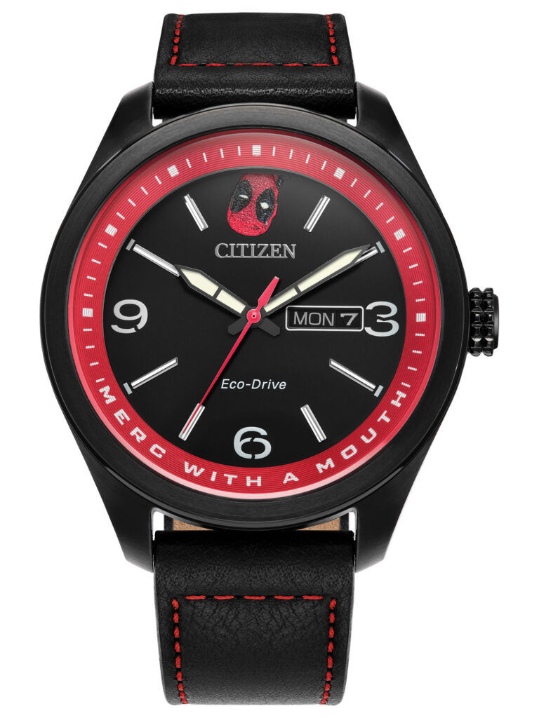 Citizen Marvel – Deadpool: Seu mostrador preto texturizado apresenta um Wade Wilson mascarado olhando diretamente para você, de cabeça para baixo, na posição das 12 horas. O anel interno vermelho exibe o apelido do personagem, “Merc With a Mouth”, que se ilumina junto com os olhos, os ponteiros e os marcadores. No verso da caixa há uma gravação do super-herói em uma pose deitado. A caixa de 42 mm em aço inoxidável com tratamento IP preto e a pulseira de couro combinando com costuras vermelhas refletem as cores marcantes do personagem. Equipado com movimento calibre J800 com tecnologia Eco-Drive, que funciona com qualquer fonte de luz e dispensa troca de bateria, o modelo conta ainda com cristal mineral esférico e resistência à água de 100 m (10 bar). O relógio está disponível por R$3.990,00.