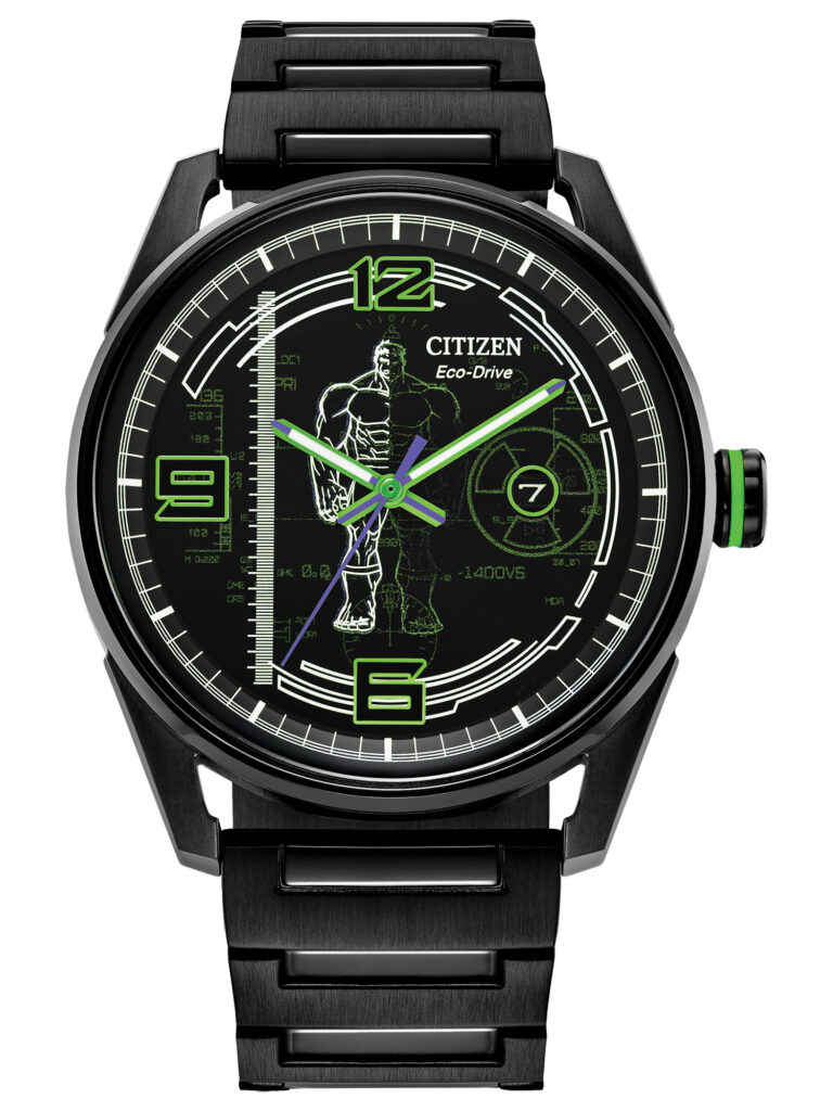 Citizen Marvel – Hulk: Traz uma estética forte e contemporânea em homenagem ao alter-ego do Hulk, com mostrador preto que destaca o personagem em pose icônica, ponteiros verdes com acabamento luminescente e ponteiro de segundos em roxo, refletindo a fusão característica de cores do herói. A caixa em aço inoxidável com banho iônico preto de 42 mm e a pulseira de aço reforçam o visual robusto da peça. Equipado com tecnologia Eco-Drive, que funciona com qualquer fonte de luz e dispensa trocas de bateria, o modelo conta ainda com cristal mineral resistente a impactos, elementos gráficos inspirados no Hulk e resistência à água de 100 m (10 bar). O relógio está disponível por R$4.490,00.
