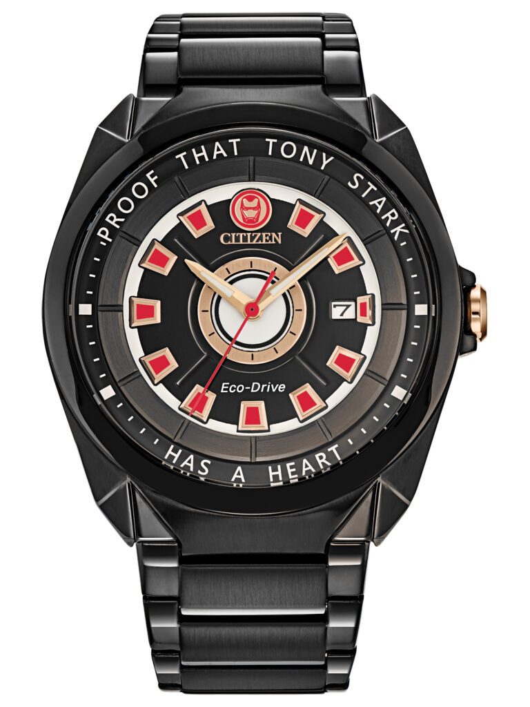 Citizen Marvel – Tony Stark: É inspirado no gênio, bilionário e filantropo do universo Marvel, trazendo um mostrador preto que remete ao Arc Reactor da armadura Mark I, com detalhes vermelhos e rosé que evocam sua iconografia tecnológica. A caixa e a pulseira em aço inoxidável preto reforçam o caráter técnico e sofisticado do modelo, enquanto a inscrição “Proof That Tony Stark Has A Heart”, gravada no anel interno do mostrador, adiciona uma camada emocional e narrativa única à peça. Equipado com movimento calibre J810 com tecnologia Eco-Drive, que funciona com qualquer fonte de luz e dispensa troca de bateria, o modelo conta ainda com cristal mineral resistente a impactos e resistência à água de 50 m (5 bar). O relógio está disponível por R$4.490,00.