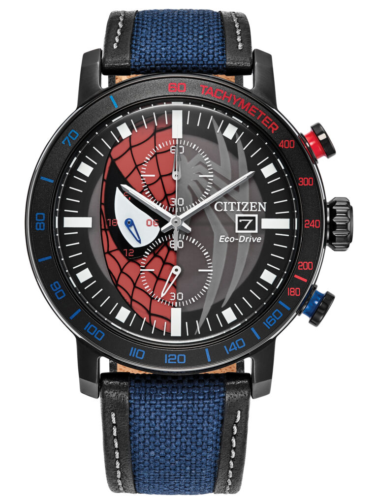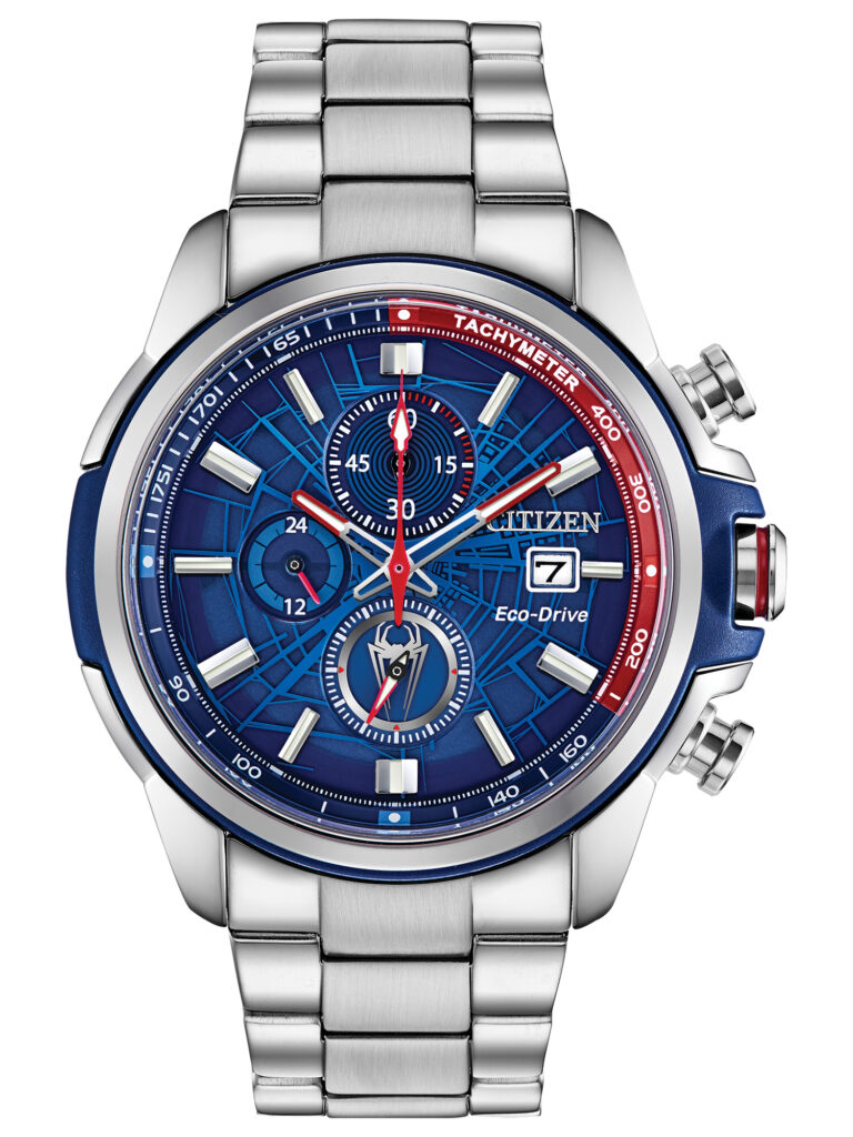 Citizen Marvel – Spider-Man: Traz inspiração no universo urbano do herói, com mostrador azul marcado por detalhes vermelhos e padrão de teia gravada que evoca o dinamismo característico de Spider-Man. A caixa em aço inoxidável prateado de 44 mm e a pulseira de aço reforçam a robustez e a elegância esportiva da peça. Equipado com movimento calibre B612 com tecnologia Eco-Drive, que funciona com qualquer fonte de luz e dispensa troca de bateria, o modelo conta com cristal mineral resistente a impactos, cronógrafo 1/5 s até 60 minutos, função 12/24h, taquímetro e elementos gráficos temáticos do Homem-Aranha. Com resistência à água de 100 m (10 bar), o relógio está disponível por R$4.990,00.