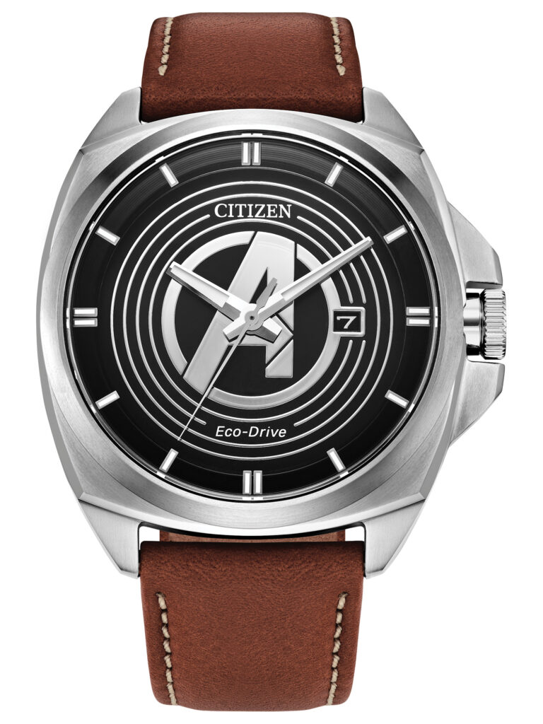 Citizen Marvel – Avengers Legacy: Apresenta um design inspirado na força e união dos Vingadores, combinando robustez e elegância em um mostrador preto com o logotipo tridimensional “A” em destaque. A caixa de aço inoxidável prateado de 42 mm e a pulseira em couro marrom conferem ao modelo um visual versátil e sofisticado. Equipado com movimento calibre J810 e tecnologia Eco-Drive, que funciona com qualquer fonte de luz e dispensa troca de bateria, o relógio traz cristal de safira, marcadores luminosos para ótima legibilidade e resistência à água de 100 m (10 bar). O modelo está disponível por R$4.490,00.