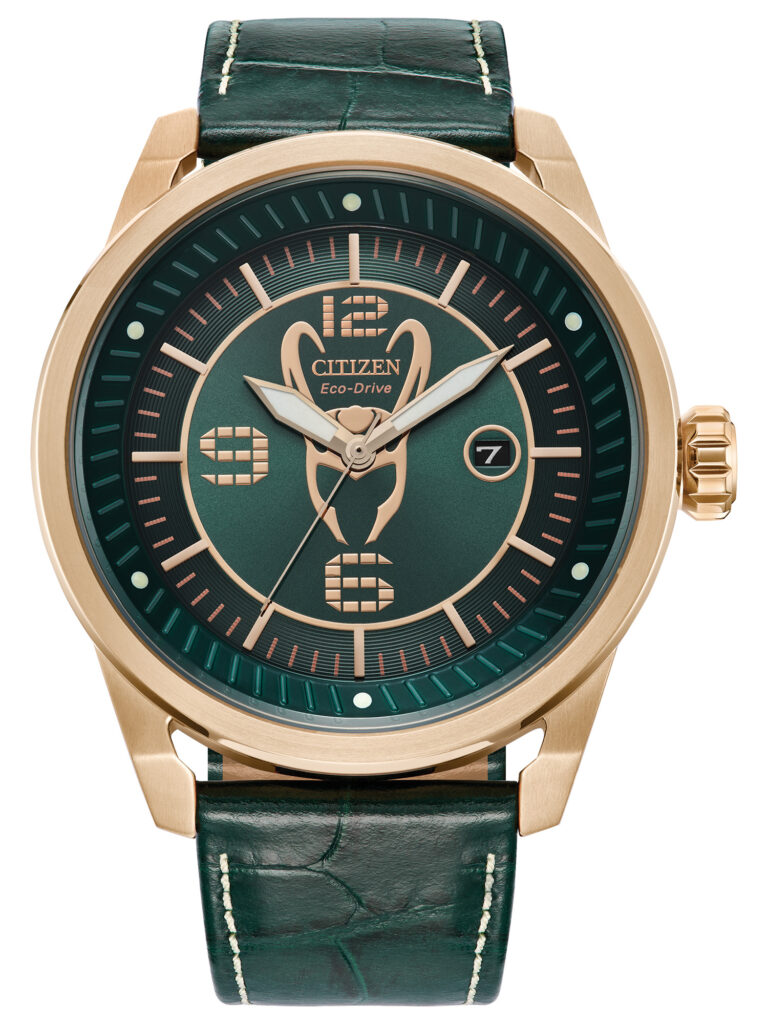 Citizen Marvel – Loki: É inspirado no icônico Deus da Trapaça e apresenta um mostrador verde com o capacete dourado em ouro-rosê em destaque no centro, acompanhado de marcadores e texturas que remetem à estética sofisticada do vilão. A caixa em aço inoxidável com acabamento rosê, de 45 mm, combina com a pulseira de couro verde com textura tipo crocodilo, criando um visual premium e temático. O modelo utiliza movimento calibre J810 com tecnologia Eco-Drive, que funciona com qualquer fonte de luz e dispensa troca de bateria, além de contar com cristal mineral resistente a impactos, janela de data, marcadores rosê e resistência à água de 100 m (10 bar). O relógio está disponível por R$3.990,00.